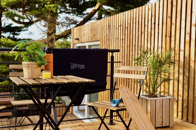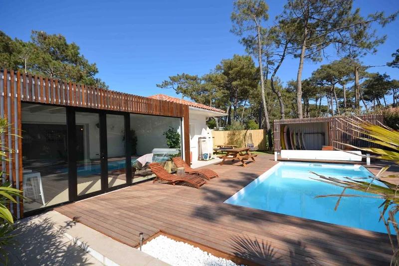 “Every surfer’s dream” — dat was precies het idee achter de plannen voor deze surf B&B in Vieux-Boucau. Een groot en luxe huis met een gezellige living, een verwarmd zwembad in de tuin, fijne chill-out plekken, een yoga-deck en dat alles pal achter de duinen.