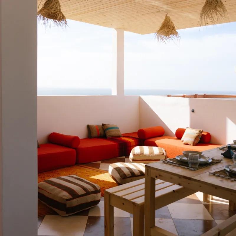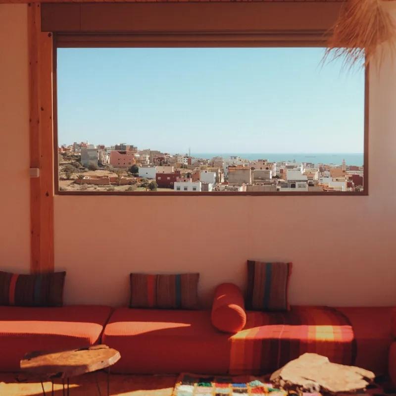 Tijdens het surfkamp logeren we samen in Surfhouse The Horizon in Tamraght: een kleine, warme plek waar ontspannen en samen genieten vanzelf gaat. Het huis ligt rustig op een heuvel, precies tussen bergen en oceaan in. Dat betekent: wakker worden met een open zicht op de Atlantische kust, en de dag afsluiten met het dorp onder je en de zon die langzaam in de zee zakt.