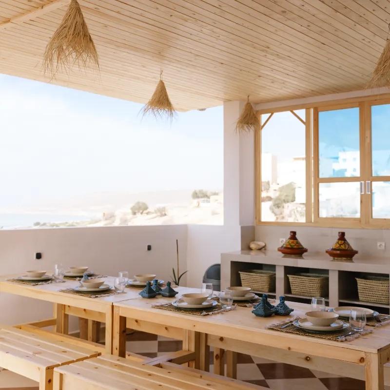 Binnen voelt The Horizon meteen vertrouwd aan, maar dan met het comfort van een frisse update. Het surfhouse kreeg in november 2024 een renovatie, waardoor traditionele Marokkaanse accenten mooi samengaan met hedendaagse afwerking. Je vindt er gezellige gemeenschappelijke ruimtes om na het surfen samen te komen, zonder dat het ooit groot of onpersoonlijk aanvoelt.